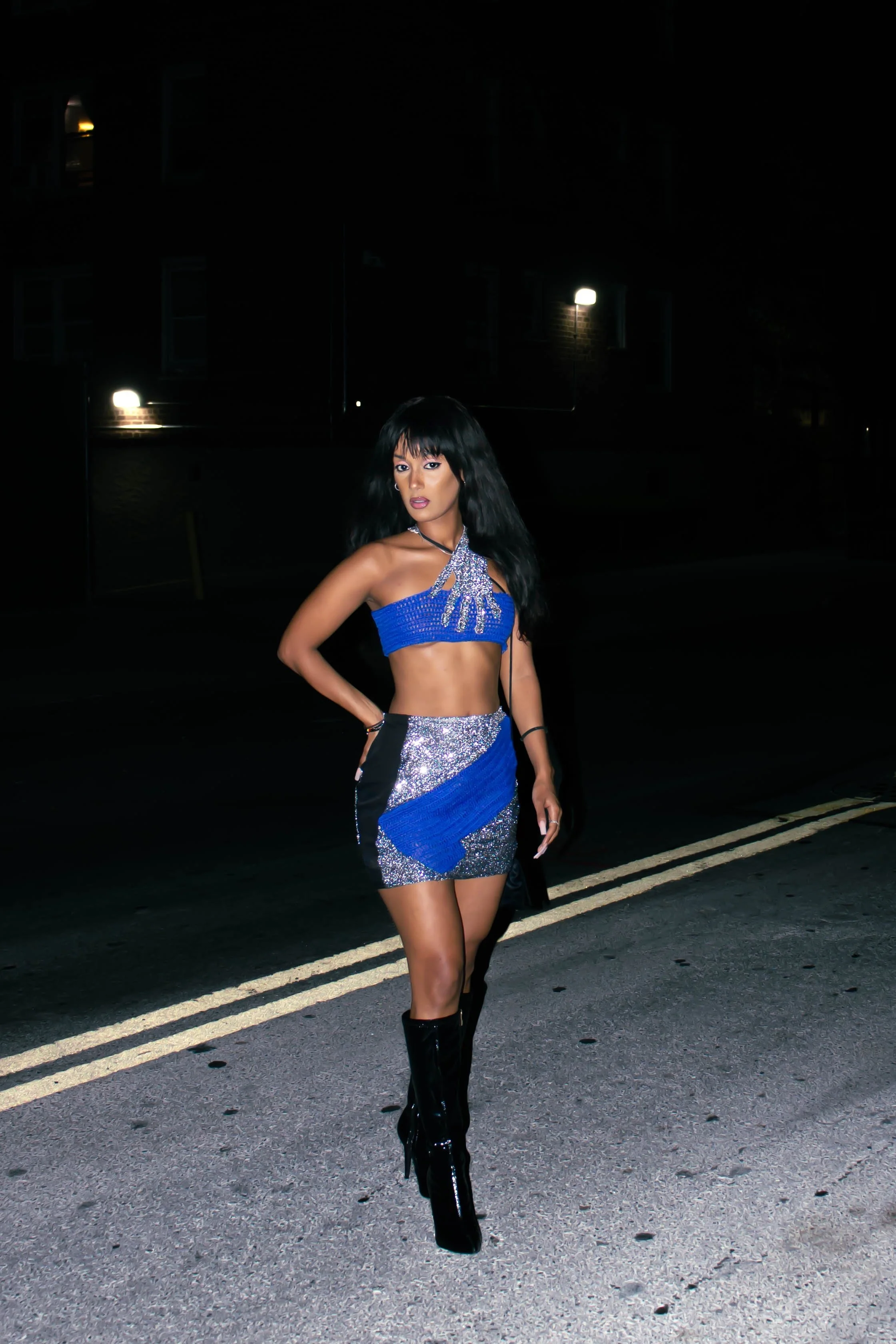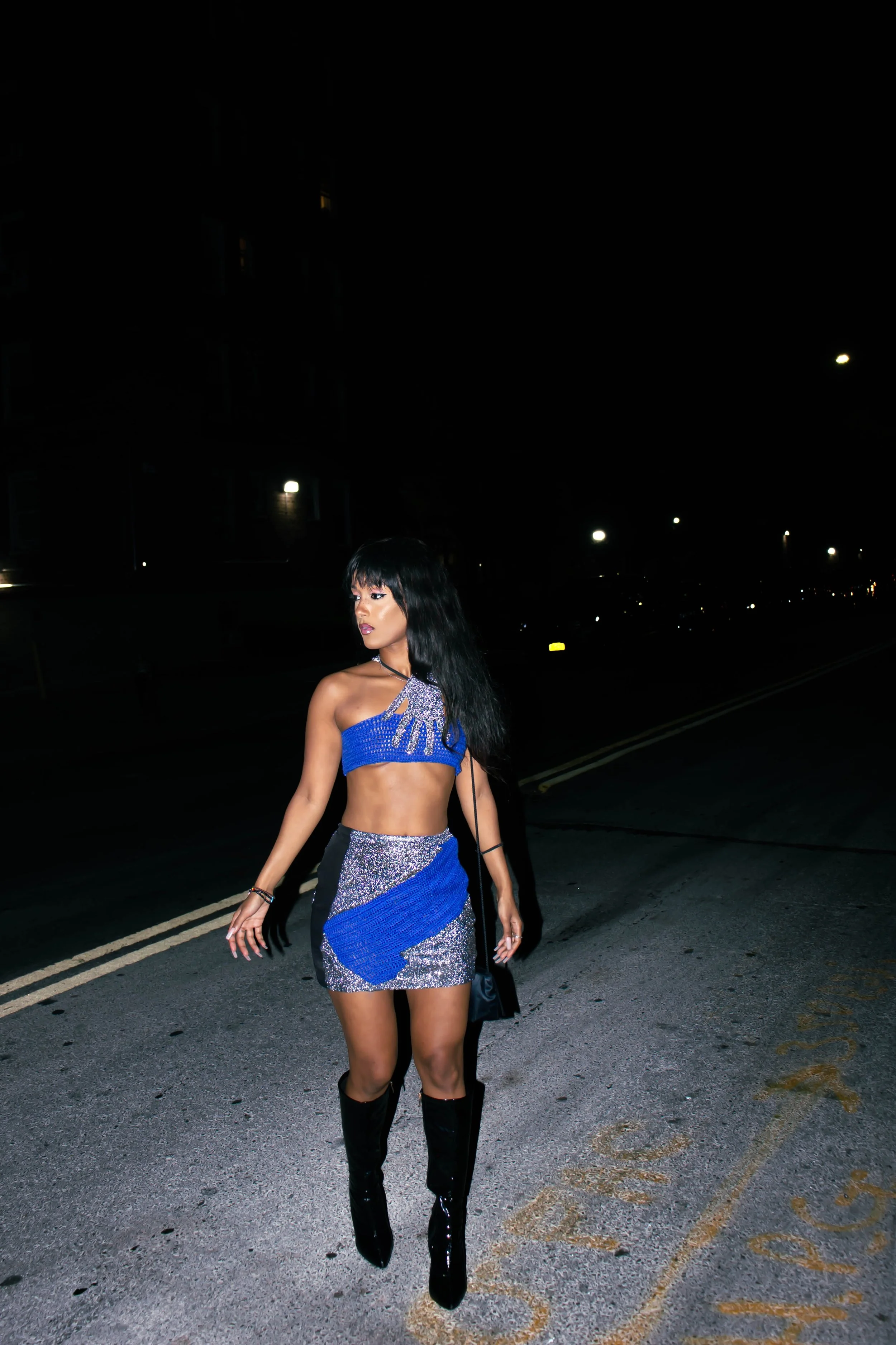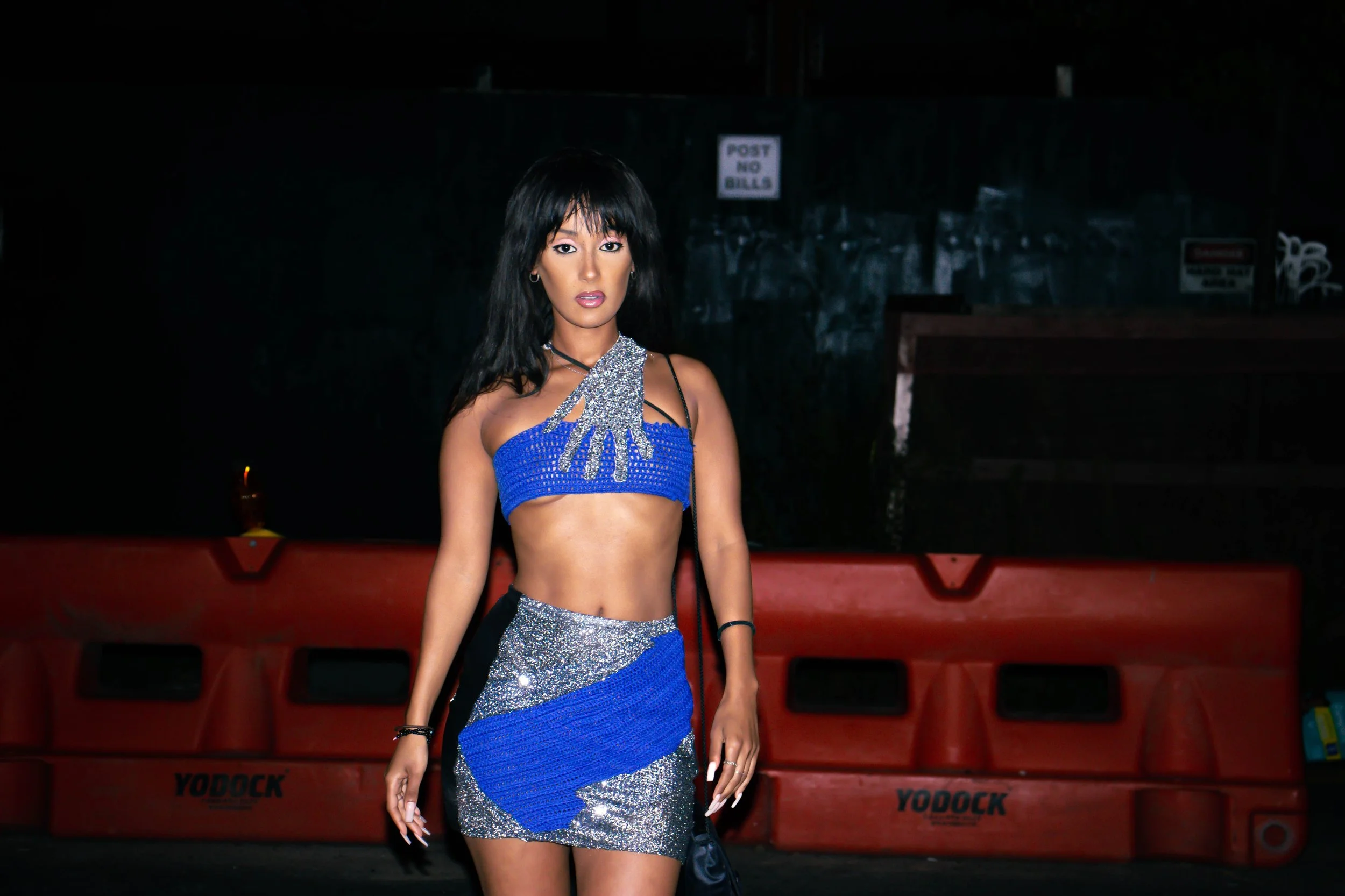 The original idea was to create a hand cutout for a handle on a bag, that didn't work. The final look is the hand cutout wrapped around me. Hints of Blue in honor of #BlueFaces, and touches of Black outlining my skirt for shape. I'm very happy with the results, and I got to wear it out to the Diesel after party at Ludlow House. #nyfw